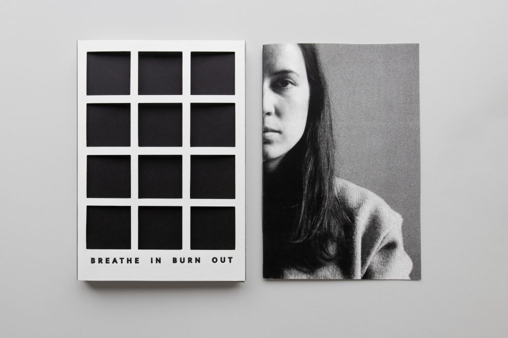 I just recently came across one of their handmade books, which caught my attention instantly. Dora Lionstone‘s „BREATHE IN BURN OUT“ – a very intimate book about her inner self being challenged by a problematic birth and the subsequent difficulties of daily life. It‘s a serial work, containing 1000 self portraits, reworked from the same picture, scratched, rubbed, overpainted, changed with a fervour only the truly suffering soul can create. Inside the hand-cut cover is a poster of her and information about the situation at the time.